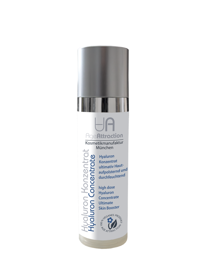 Väčšina kozmetických produktov s kyselinou hyalurónovou dostupných v obchodoch alebo lekárňach obsahuje v sušine len približne 0,1 % – 1 % hyalurónu ako účinnú koncentráciu v pomere k ostatným zložkám. Preto nie je prekvapujúce, že v testoch hyalurónových produktov často neboli zaznamenané výrazné alebo viditeľné zlepšenia pleti (pozri „WDR Markt-Scanner: Hyaluron – Faltenkiller oder Mogelpackung, 22. september 2014“). Náš Hyaluron Koncentrát patrí medzi najkoncentrovanejšie hyalurónové séra na nemeckom kozmetickom trhu. Hyaluron Koncentrát obsahuje 3 % účinného hyalurónu (v sušine), čo predstavuje približne trojnásobok bežne používaných koncentrácií, ktoré vo väčšine produktov dosahujú len okolo 1 %.